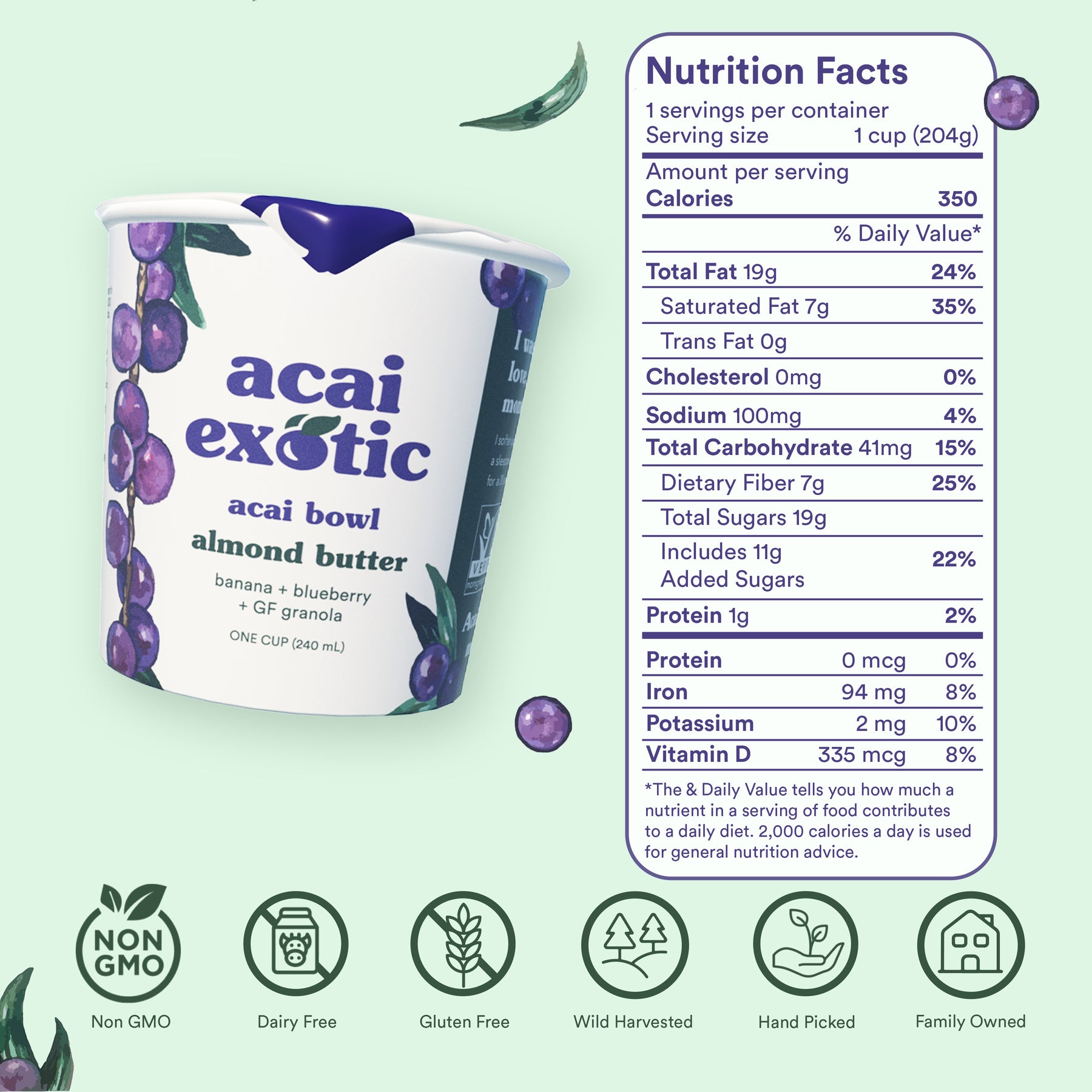 Ingredients: Acai, Blueberries, Banana, Water, Almond Butter, Gluten Free Granola (Whole Grain Oats, Agave, Brown Sugar, Salt) Coconut Cream, Raw Sugar, Less than .3% of: Guar Gum, Gum Acacia, Lime Juice