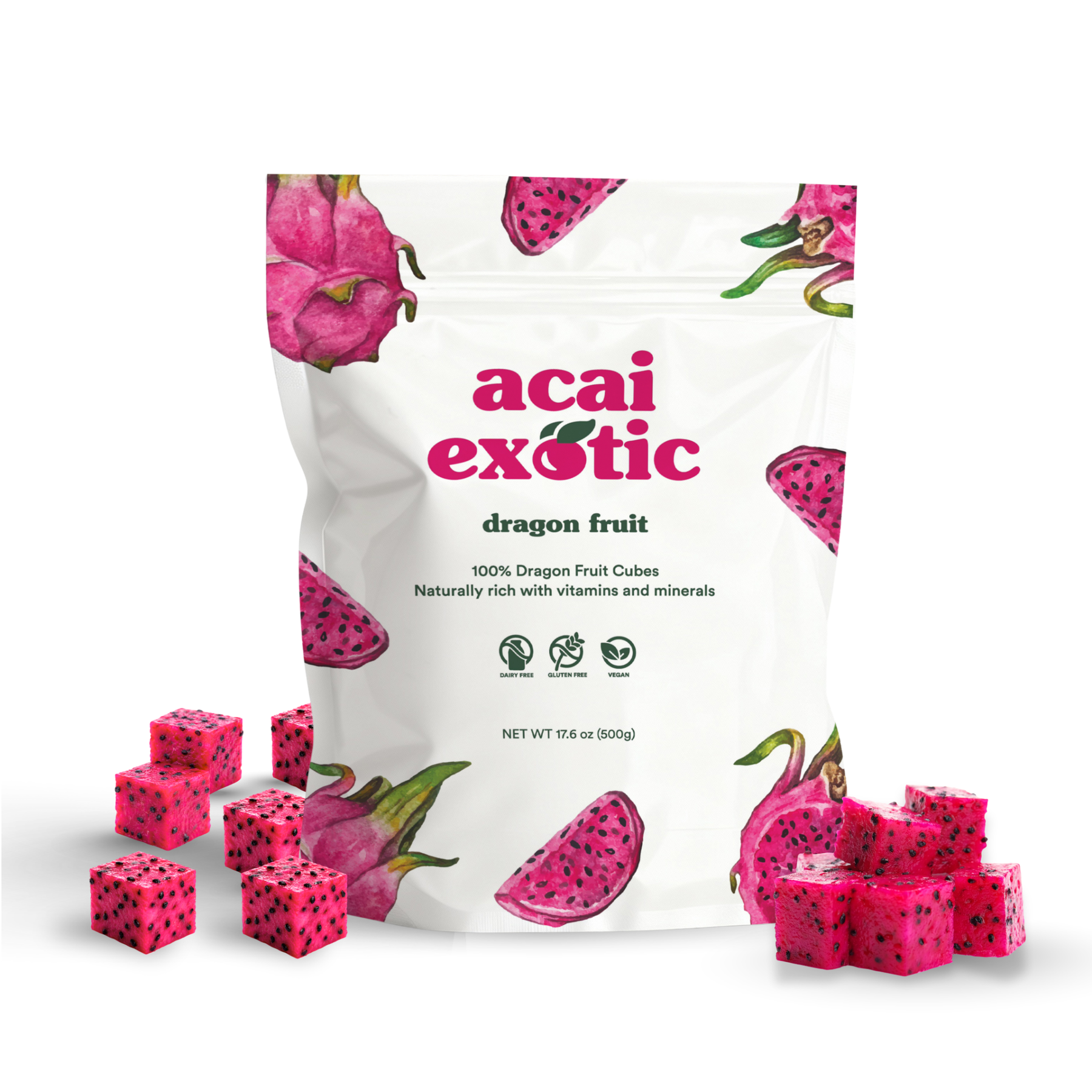 nature's most vibrant superfruit. our dragon fruit cubes are 100% pure red dragon fruit—nothing else added. sourced from a farmer's co-operative in vietnam that ensures fair wages and proper working conditions, these ready-to-eat cubes bring stunning natural color and serious nutrition to your kitchen.